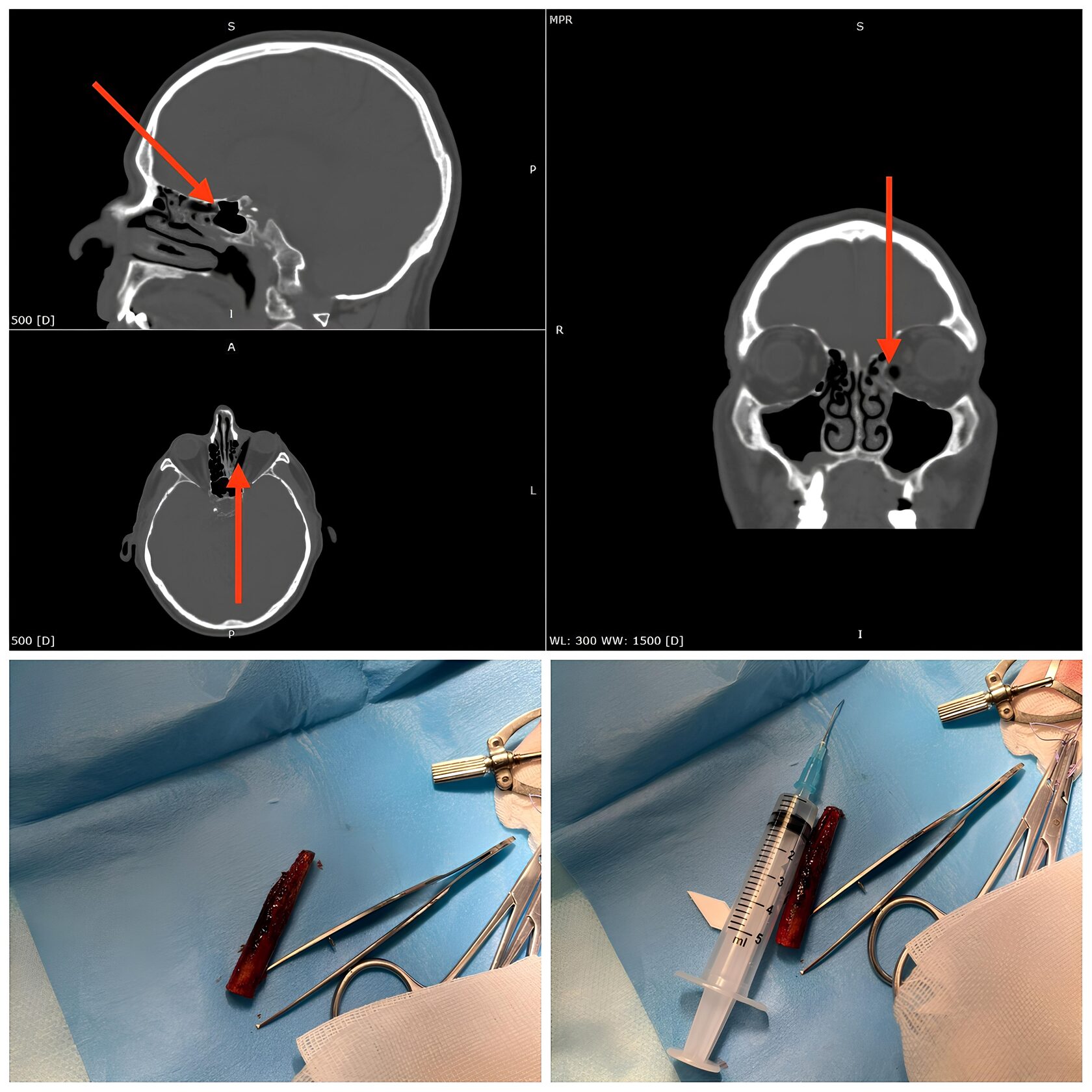 В ВЧП есть участки гиперплазии слизистой, киста ВЧП мелкого диаметра. Инородное тело - щепка, пациент рубил дерево. Под общим обезболиванием совместно с окулистом было выполнено удаление инородного тела наружным доступом