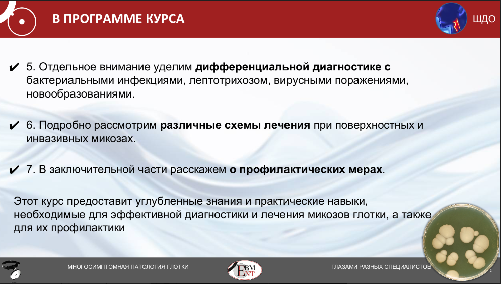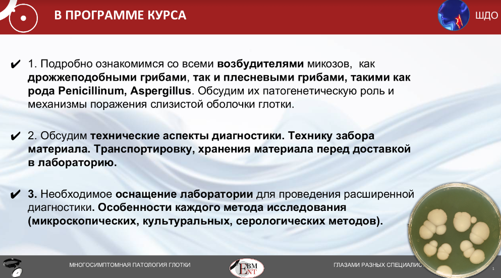 На вебинаре будут разобраны нюансы грибковой патологии глотки. На основе 3 разных клинических случаев, которые могут встретиться на приеме каждого врача-оториноларинголога